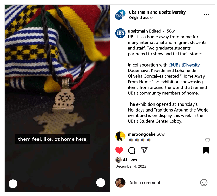 Opening during Thursday’s Holidays and Traditions Around the World event, the exhibition resonated with the University community. On display in the UBalt Student Center Lobby, “Home Away from Home” stirred emotions and fostered a deeper understanding of the diverse experiences within the UBalt community.